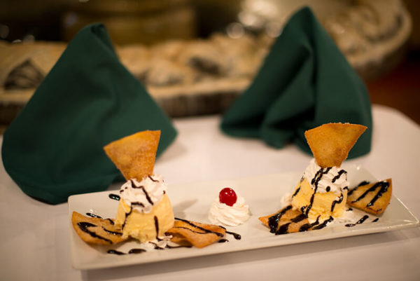 Crispy, puffy, deep-fried pastry served with ice cream and topped with chocolate sauce whipped cream and sprinkles.