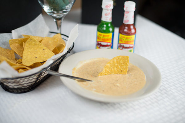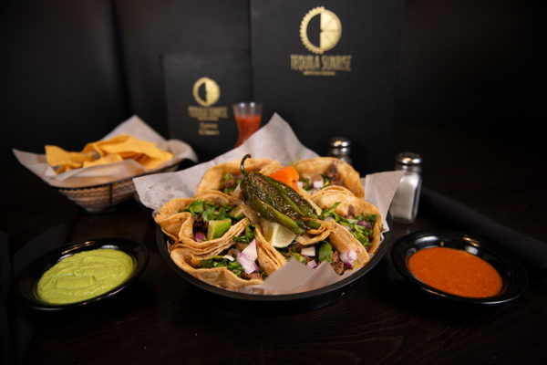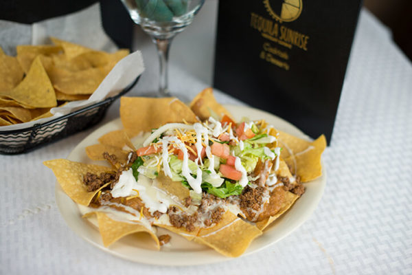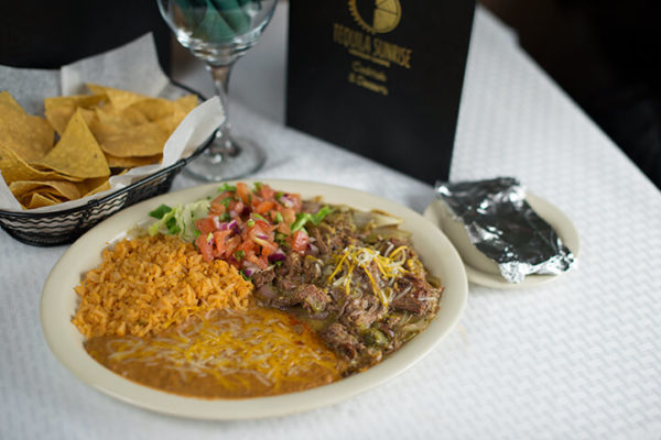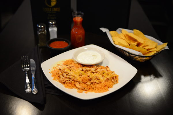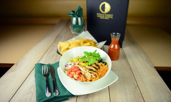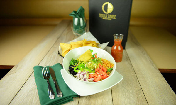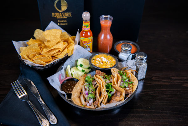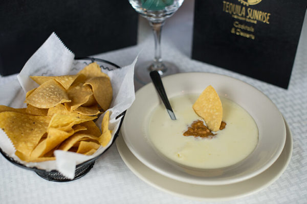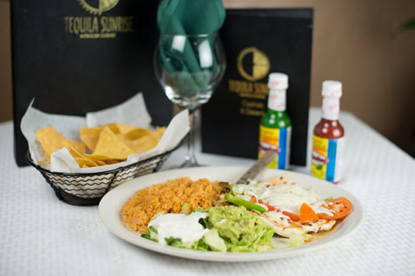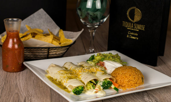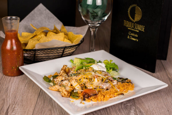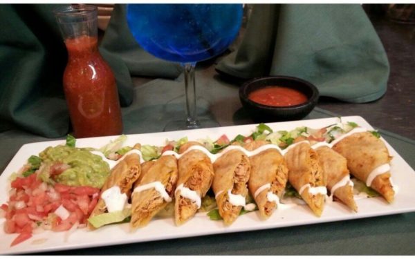 Tequila Sunrise classic chicken and spinach taquitos. Lettuce, tomatoes, shredded cheese, avocados, sour cream and a chipotle-queso-bean dip.