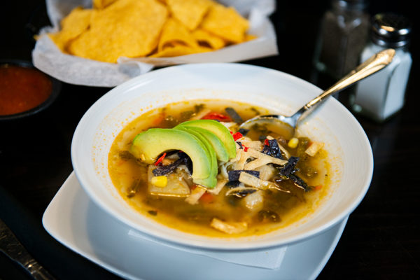 Hearty chicken soup with, potatoes, carrots, celery, corn, and green beans. Topped with tortilla strips, avocado and shredded cheese.