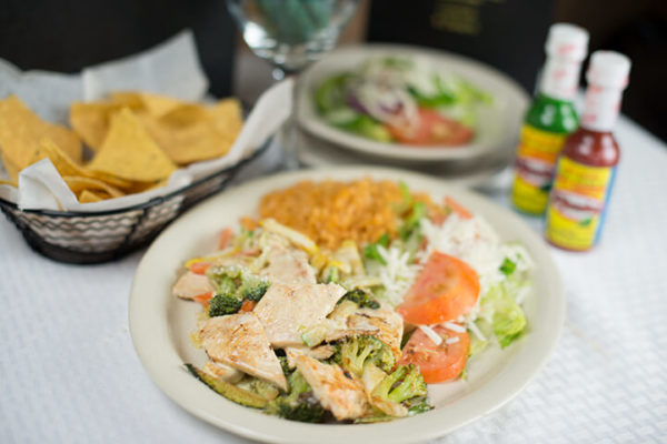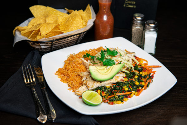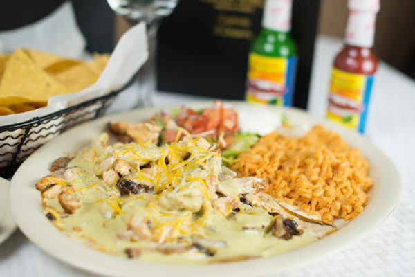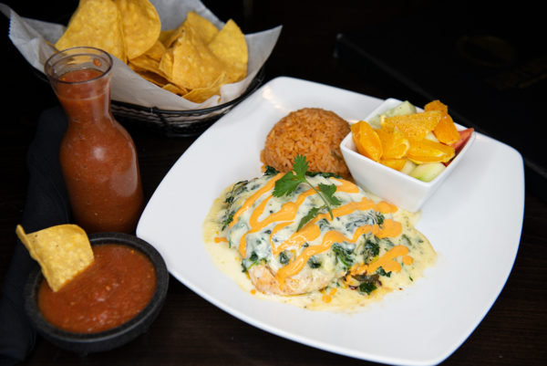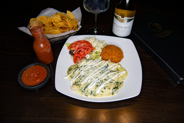 Three corn tortillas stuffed with chicken, spinach, sweet corn, then smothered with cheesy-spinach sauce and sour cream. Served with rice; garnished with lettuce, tomato and mozzarella cheese.