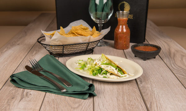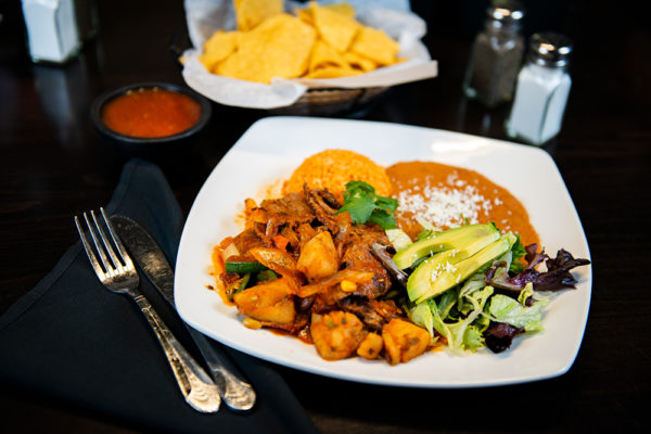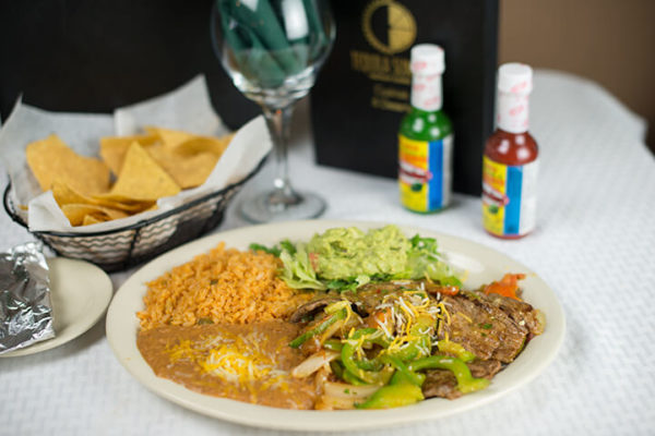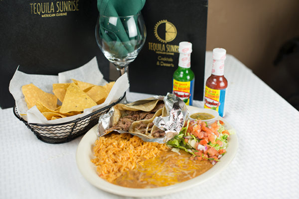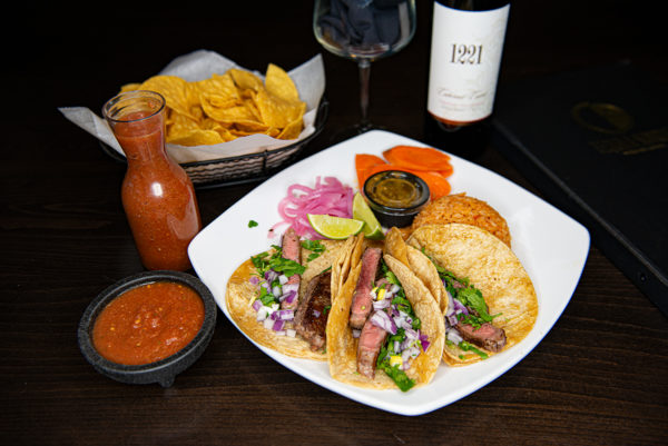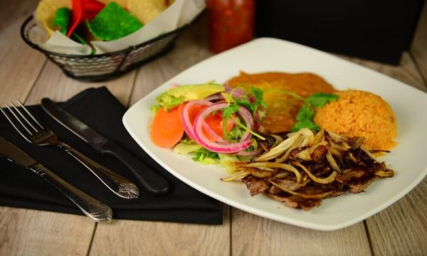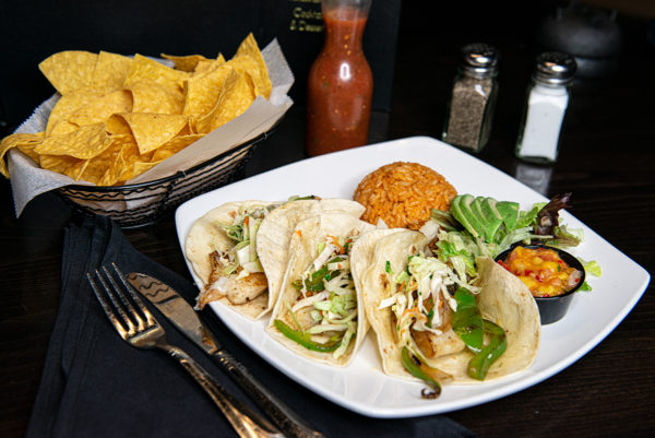 3 corn tortillas filled with steak and grilled onions. Served with rice, beans, lettuce, pico de gallo, and tomatillo sauce.