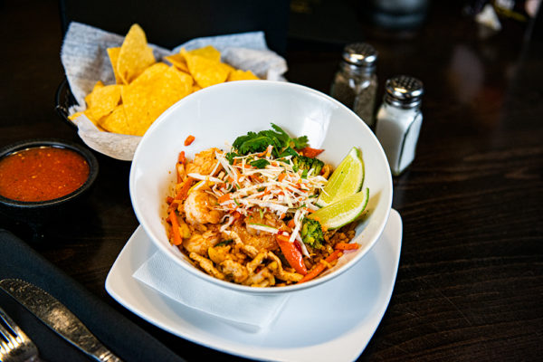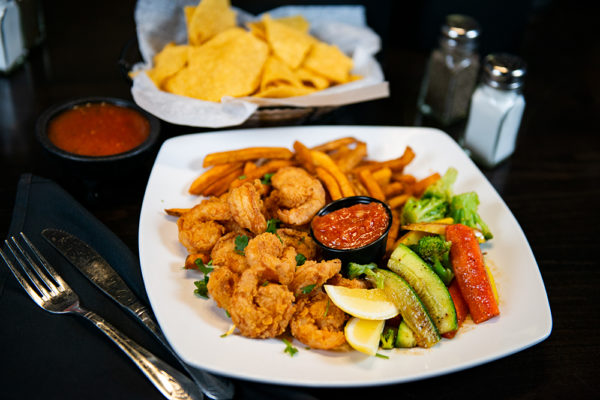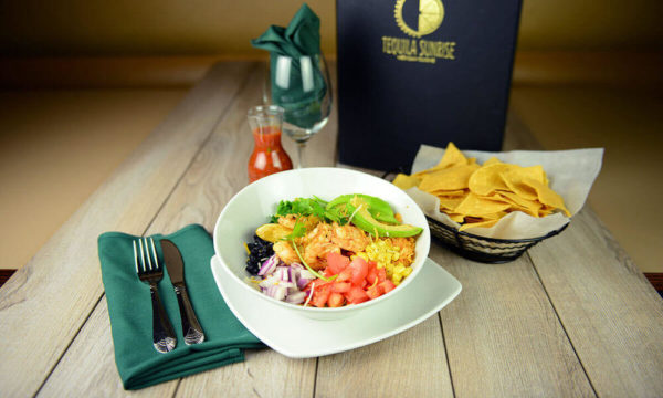 Grilled shrimp, rice, black beans, lettuce, diced tomatoes, onions, cilantro, sweet corn, Monterey Jack cheese, and avocado.