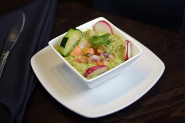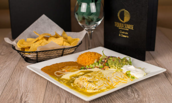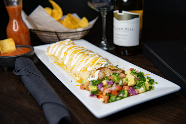 A large tortilla stuffed with grilled chicken in green sauce, rice, black beans, lettuce, tomatoes, and onions. Covered in verde sauce and melted cheese. Served with guacamole, pico, and sour cream.