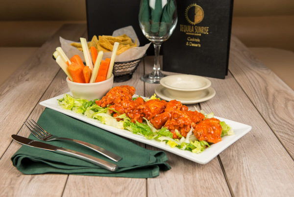 Nine chicken wings smothered in chipotle and buffalo sauce. Served with slices of carrots, and celery,
