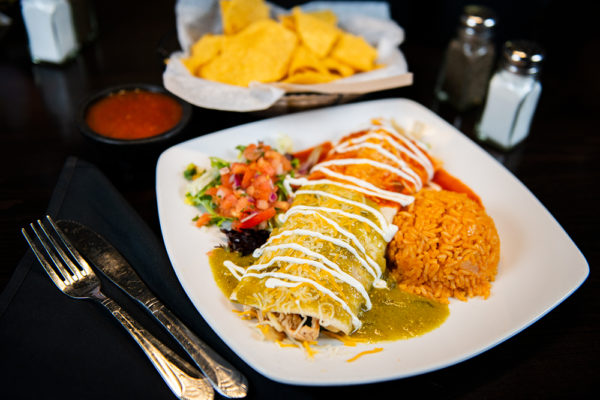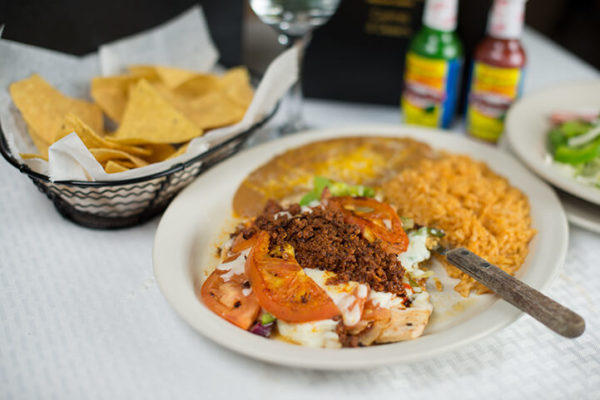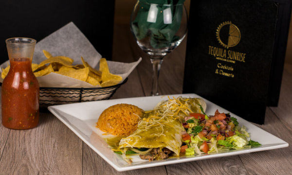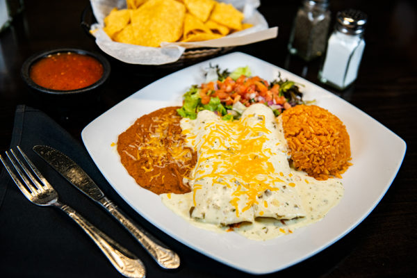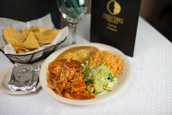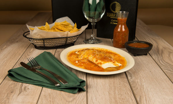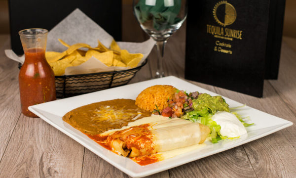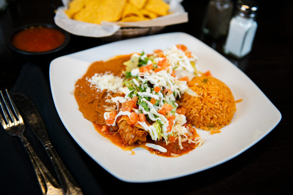 A medium size tortilla stuffed with ground beef or shredded chicken, covered with a non-spicy red sauce. Topped with lettuce, diced tomatoes, shredded cheese, and sour cream. Served with rice and refried beans.