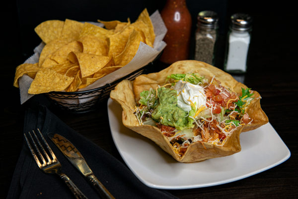 Tortilla bowl filled with lettuce, ground beef or shredded chicken, queso dip, tomatoes, shredded cheese, sour cream and guacamole.