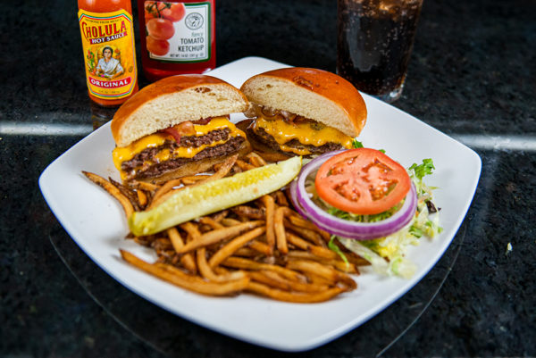 2 fresh patties, American or Swiss cheese, bacon, lettuce, onions, tomato, pickled spear, and homemade fries.