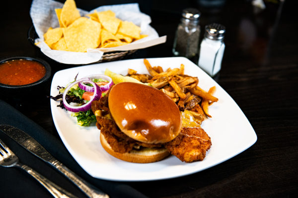 Grilled chicken sandwich or breaded chicken with the works, American or Swiss cheese, bacon, and fries.
