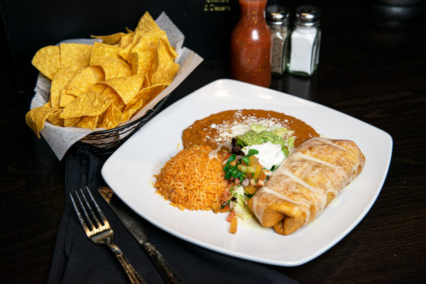 A flour tortilla stuffed with shredded chicken and mole sauce, then deep-fried to a golden brown. Topped with cheese sauce and served with lettuce, guacamole, sour cream, pico de gallo, Spanish rice and refried beans.