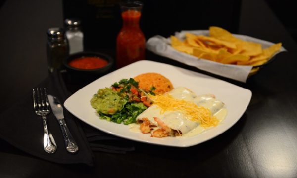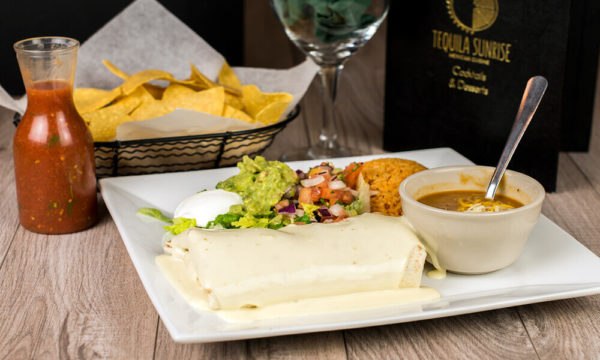A large flour tortilla stuffed with grilled chicken strips, rice, and refried beans. Covered with cilantro cream sauce and sprinkled with Monterey Jack cheese. Served with black beans, lettuce, pico de gallo, and sour cream.