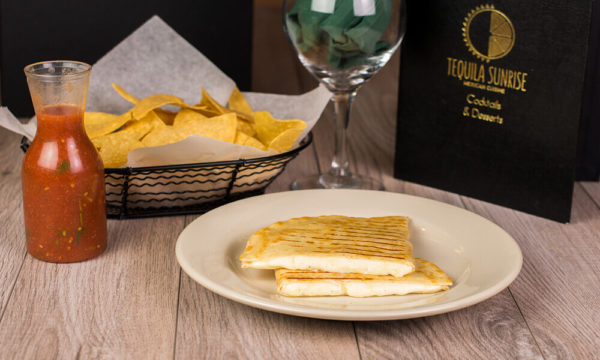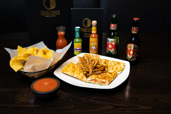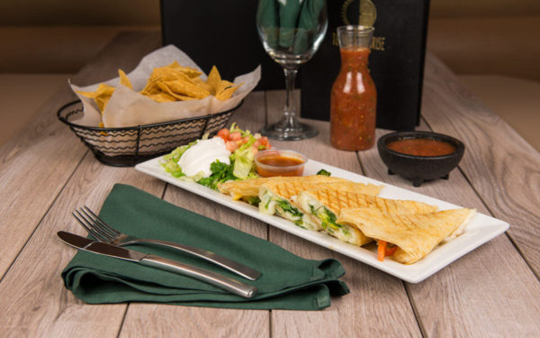 Melted cheese on a large tortilla filled with portabella mushroom, spinach, and red peppers. Served with lettuce, fresh tomatoes, sour cream, and tomato dip.