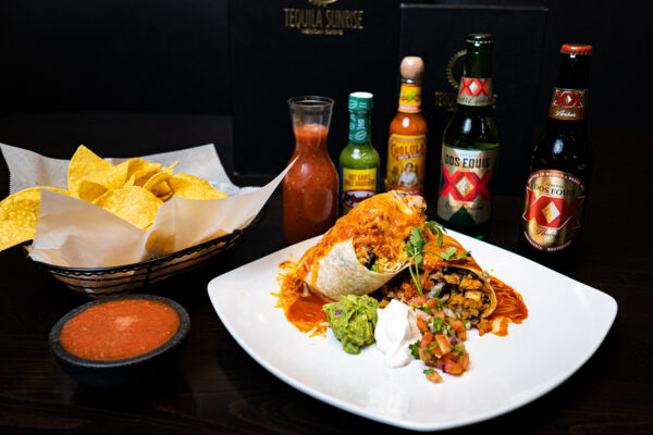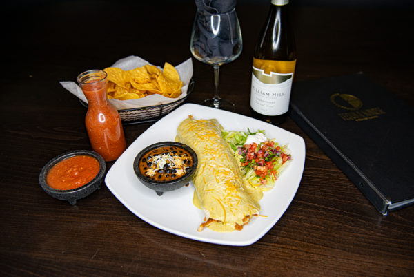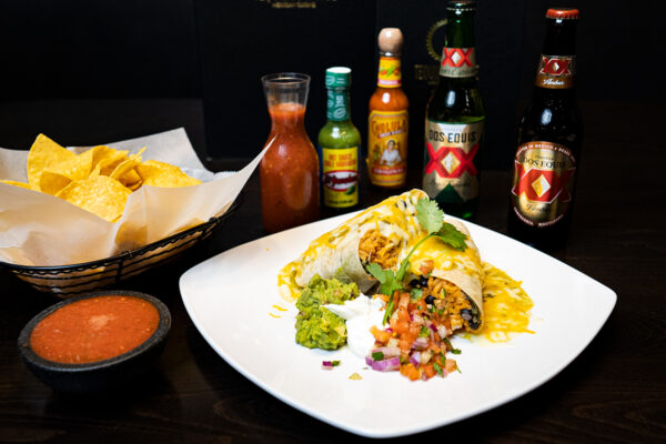 A large tortilla stuffed with spicy grilled chicken, rice, black beans, lettuce, tomatoes, and onions. Covered in red sauce and melted cheese. Served with guacamole, pico, and sour cream.