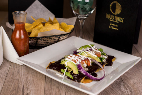 Four chicken enchiladas, covered in mole sauce. Topped with lettuce, fresh tomatoes, raw onions, avocado slices, sour cream, and cotija cheese. (This item contains peanuts)
