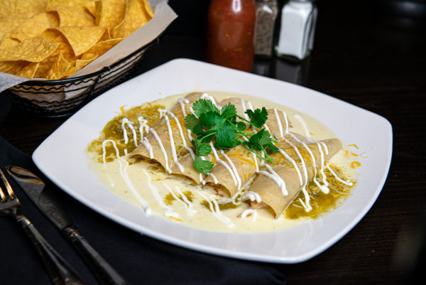 Four corn tortillas filled with grilled chicken and melted cheese. Covered in tomatillo and queso sauce, topped with sour cream and fresh cilantro.