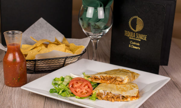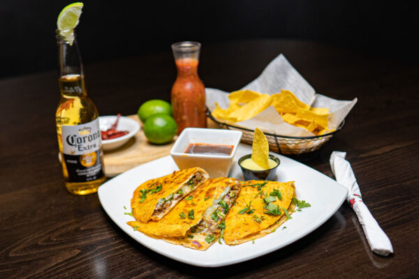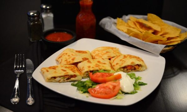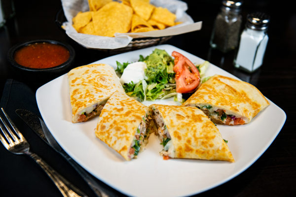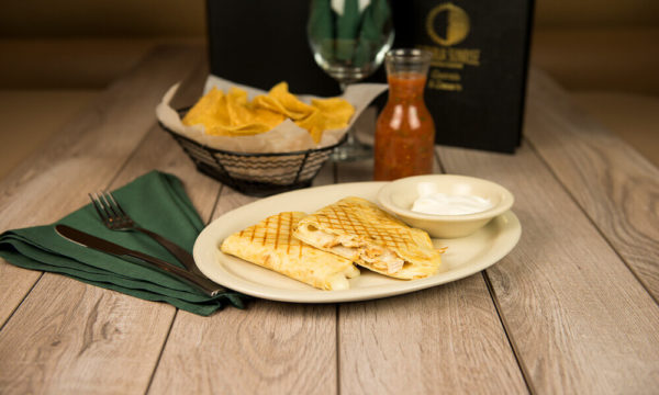 Best seller quesadilla. Melted mozzarella/provolone cheese, steak or grilled chicken, and pico de gallo. Served with lettuce, sour cream, guacamole, and fresh tomatoes.