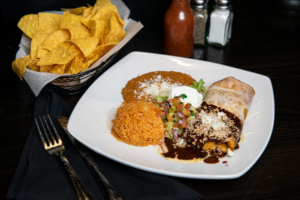 A large tortilla stuffed with mole grilled chicken, rice, black beans, lettuce, tomatoes, and onions. Covered in mole sauce and melted cheese. Served with guacamole, pico, and sour cream. (This item contains peanuts).