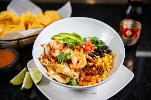 Grilled chicken, grilled shrimp, and chorizo, rice, black beans, lettuce, diced tomatoes, onions, cilantro, sweet corn, Monterey Jack cheese, and avocado.