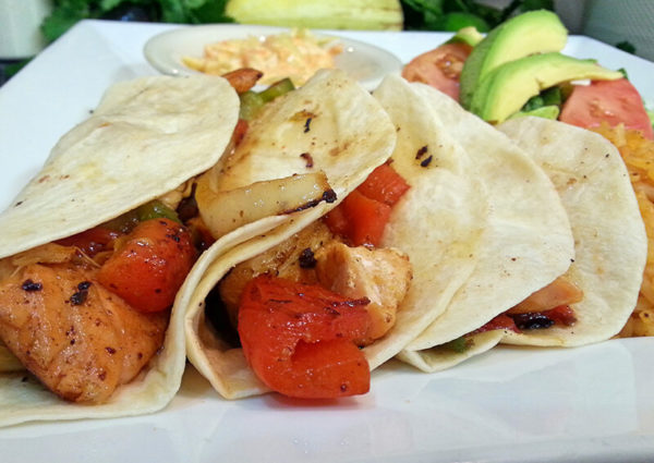 3 corn tortilla tacos, grilled chicken, red peppers, corn, and cilantro with ginger lime. Topped with spicy-lime slaw. Served with rice and avocado relish.