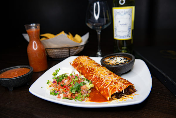 A large tortilla stuffed with our slow cooked beef in a variety of spices, rice, and refried beans. Covered with red spicy sauce. Served with black beans, lettuce, pico de gallo, and sour cream.