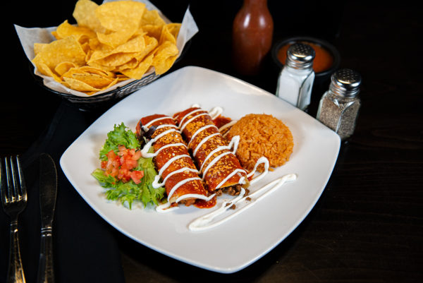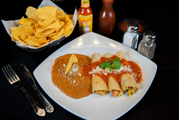 3 corn tortilla enchiladas stuffed with scrambled eggs, tomato, onions, and cilantro. Topped with mild red salsa and cotija cheese. Served with your choice of beans, rice, chicken tortilla soup, or fresh cut fries.